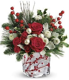 Celebrate the very heart of Christmas, and that is a heartwarming feeling that you get when sending flowers to someone special. Lovely bouquet for the holiday season with flowers and Christmas greens! The vase is not included.